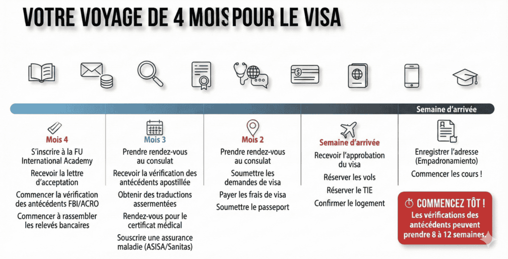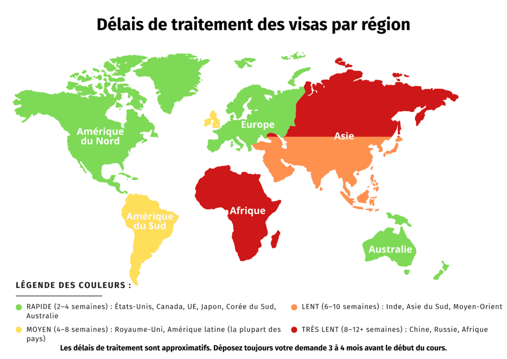 - Demande anticipée essentielle: Déposez votre dossier 90 à 120 jours avant le début du cours, particulièrement pour les visas long séjour nécessitant des documents apostillés"
